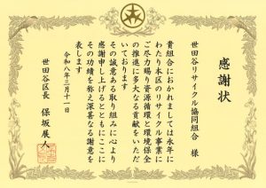 3月11日、清掃事業が東京都から23区に移管されて25年の節目にあたり、世田谷区長から、世田谷リサイクル協同組合並びに東京都環境衛生事業協同組合世田谷支部(㈱東海輸送、㈱伸和運輸、栄和清運㈱他)の2団体に対して感謝状が授与されました。